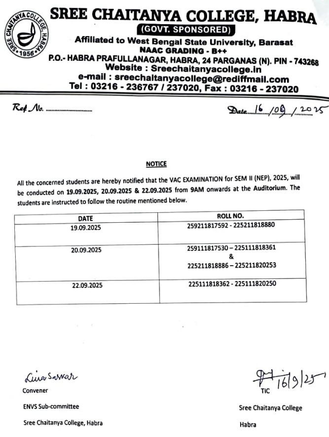 VAC Examination Schedule for SEM II (NEP), 2025 – Sree Chaitanya College, Habra